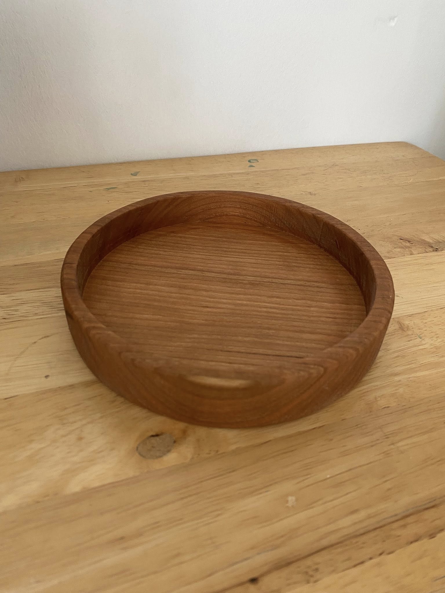 Crafted from locally sourced cherry wood, this elegant bowl is hand-carved and finished with food-safe mineral oil and beeswax for a smooth, natural sheen. Measuring 165mm across and 30mm deep, it’s perfect for serving or display.
