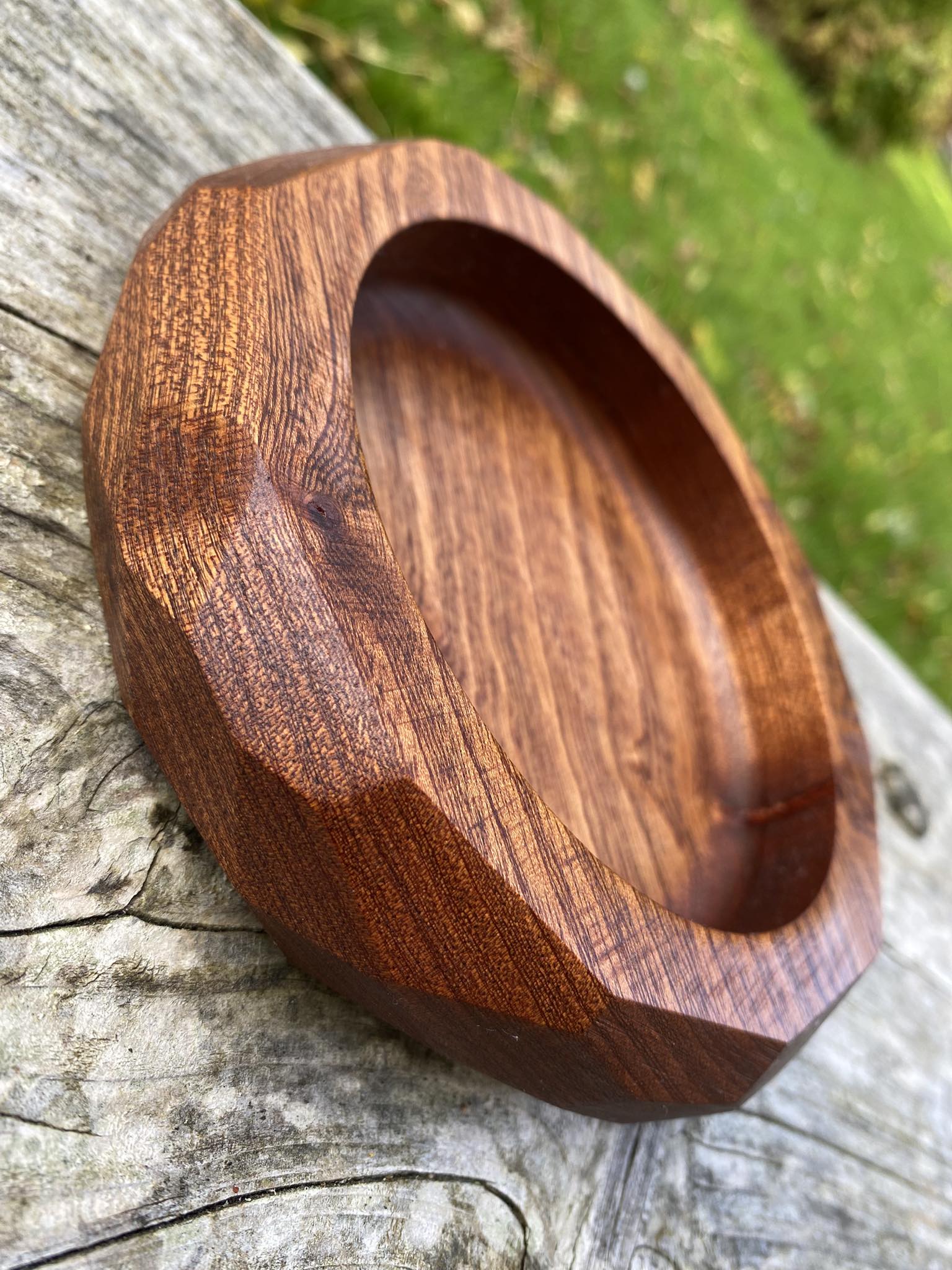 Crafted from beautiful African Sapele wood, this elegant geometric inspired bowl is hand-carved and finished with food-safe mineral oil and beeswax for a smooth, natural sheen. Measuring 150mm across and 30mm deep, it's perfect for serving or display.