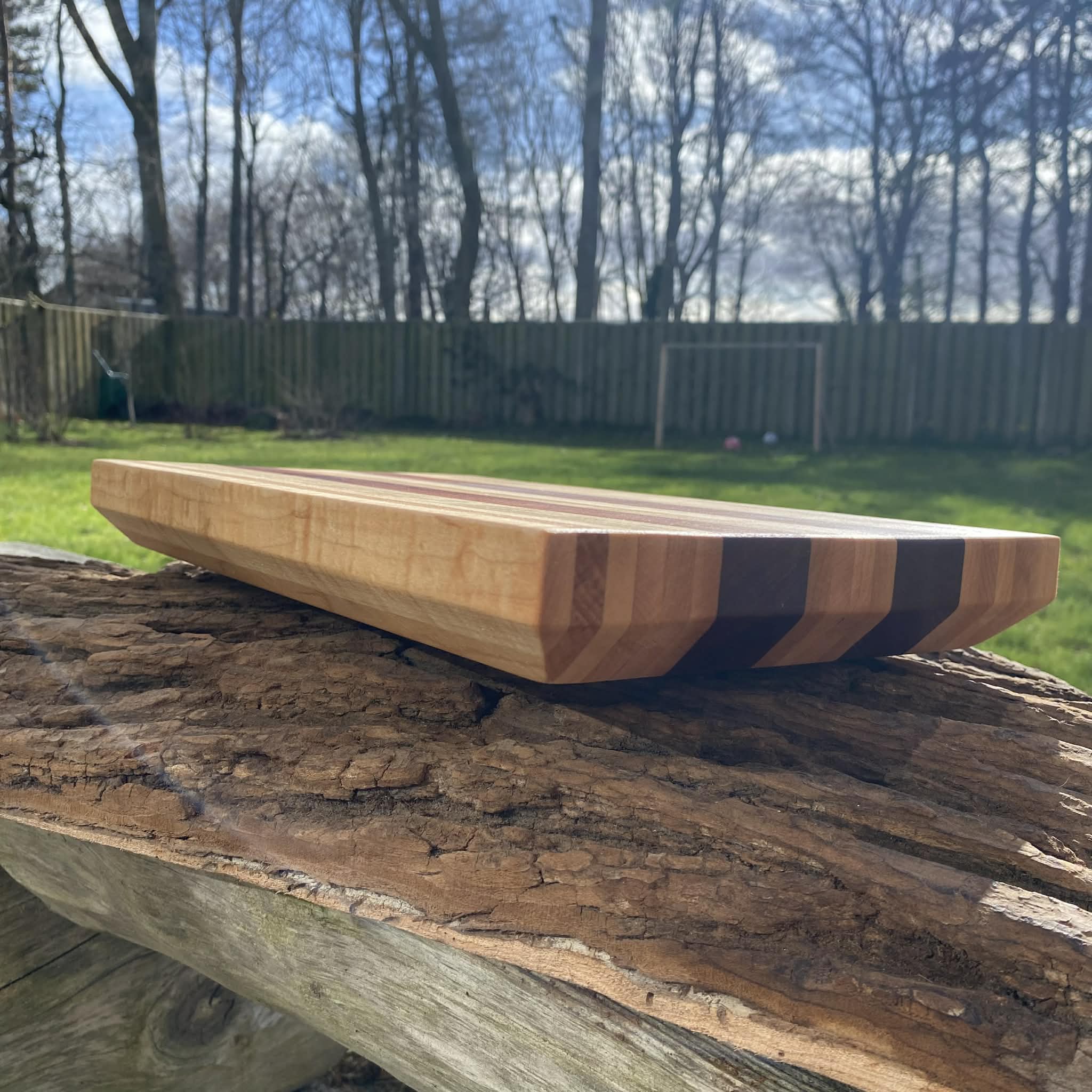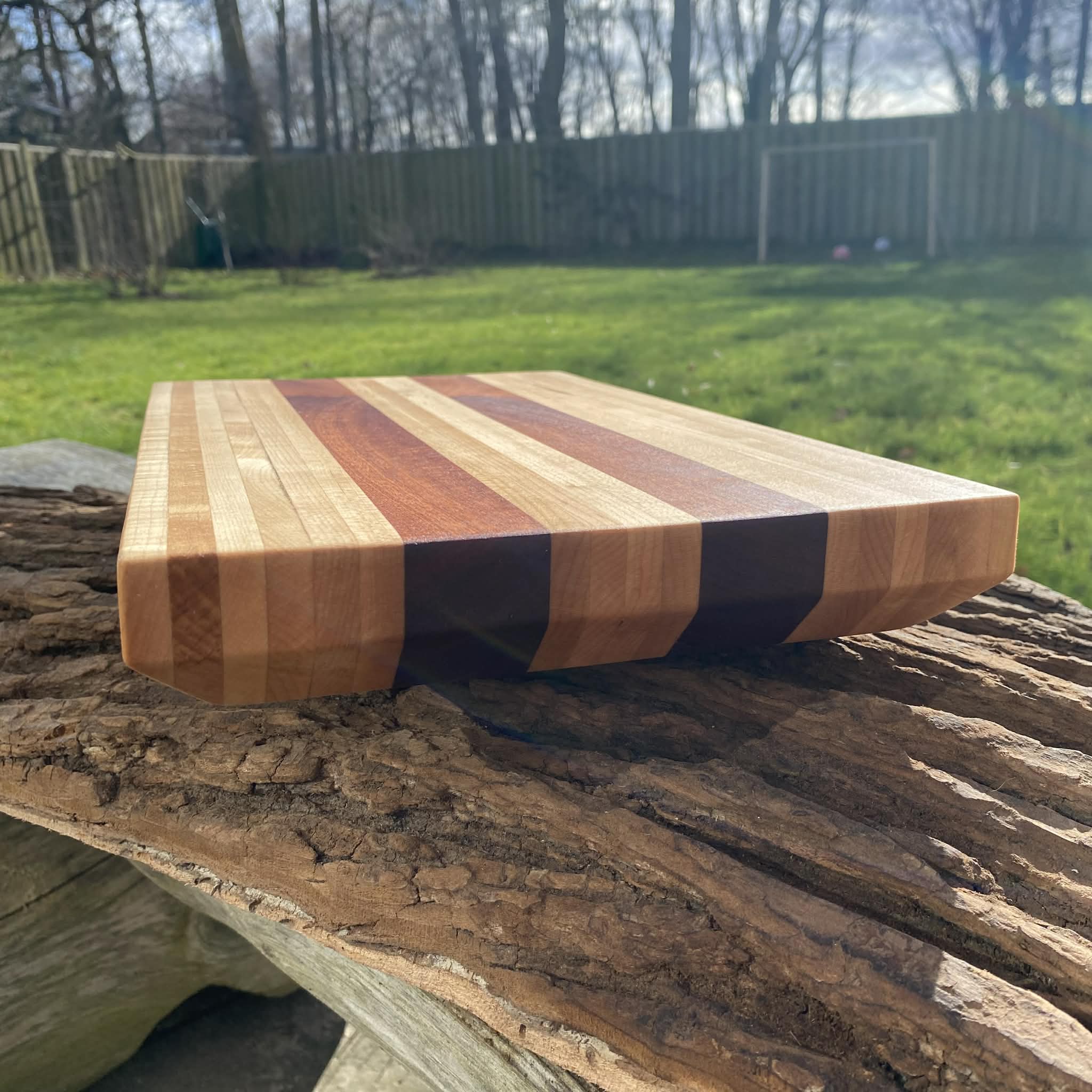 This handcrafted cutting board is made from a beautiful combination of Maple, Sapele and White Oak, carefully selected for both durability and natural character.