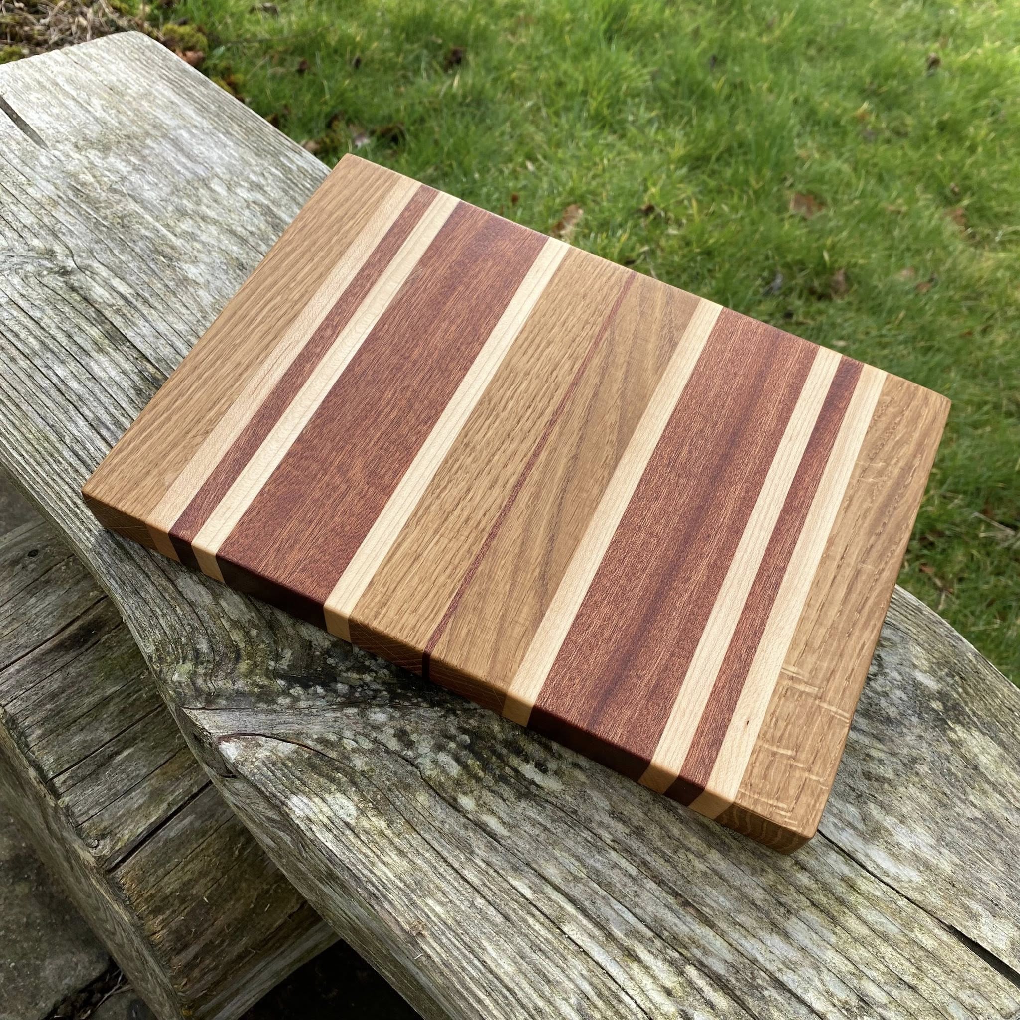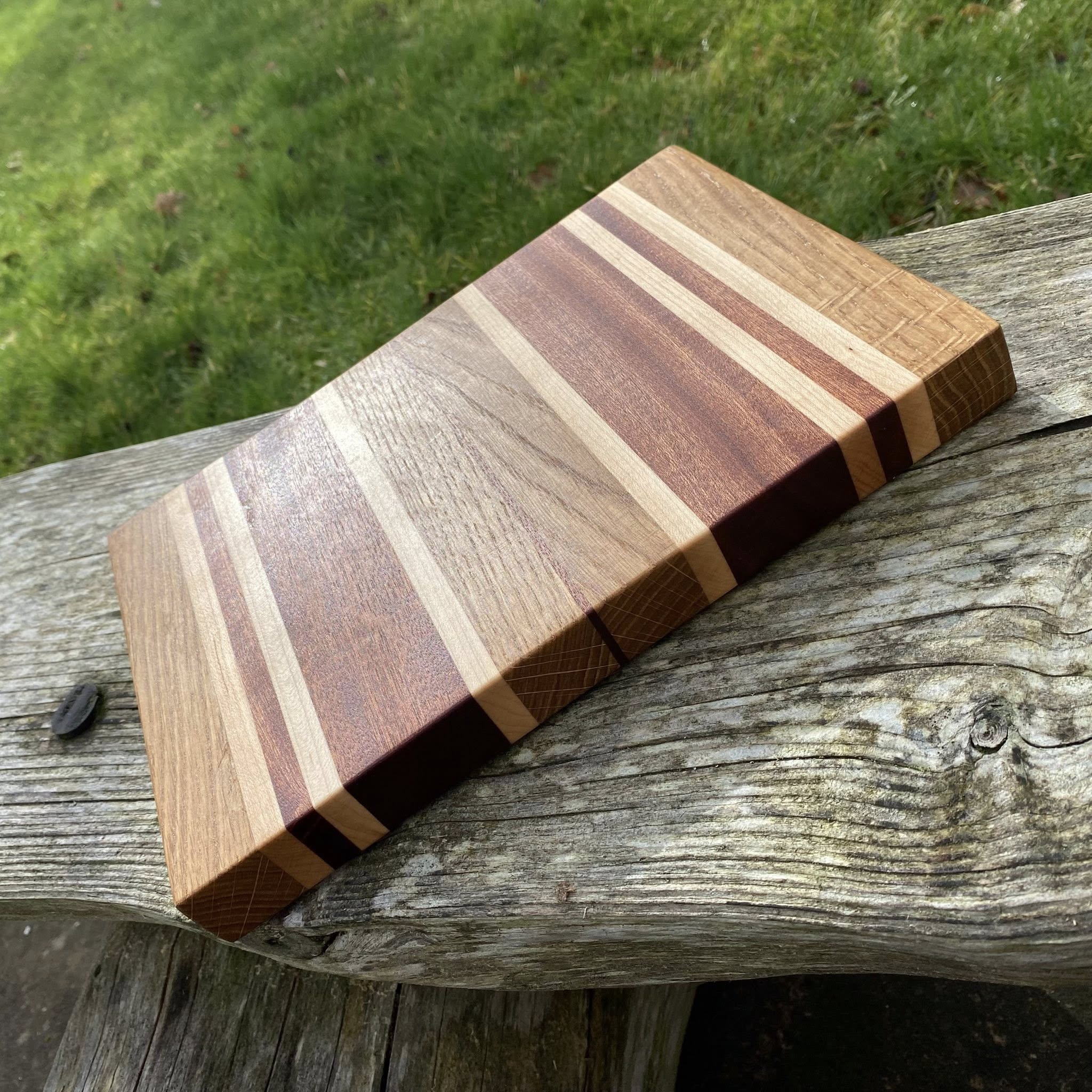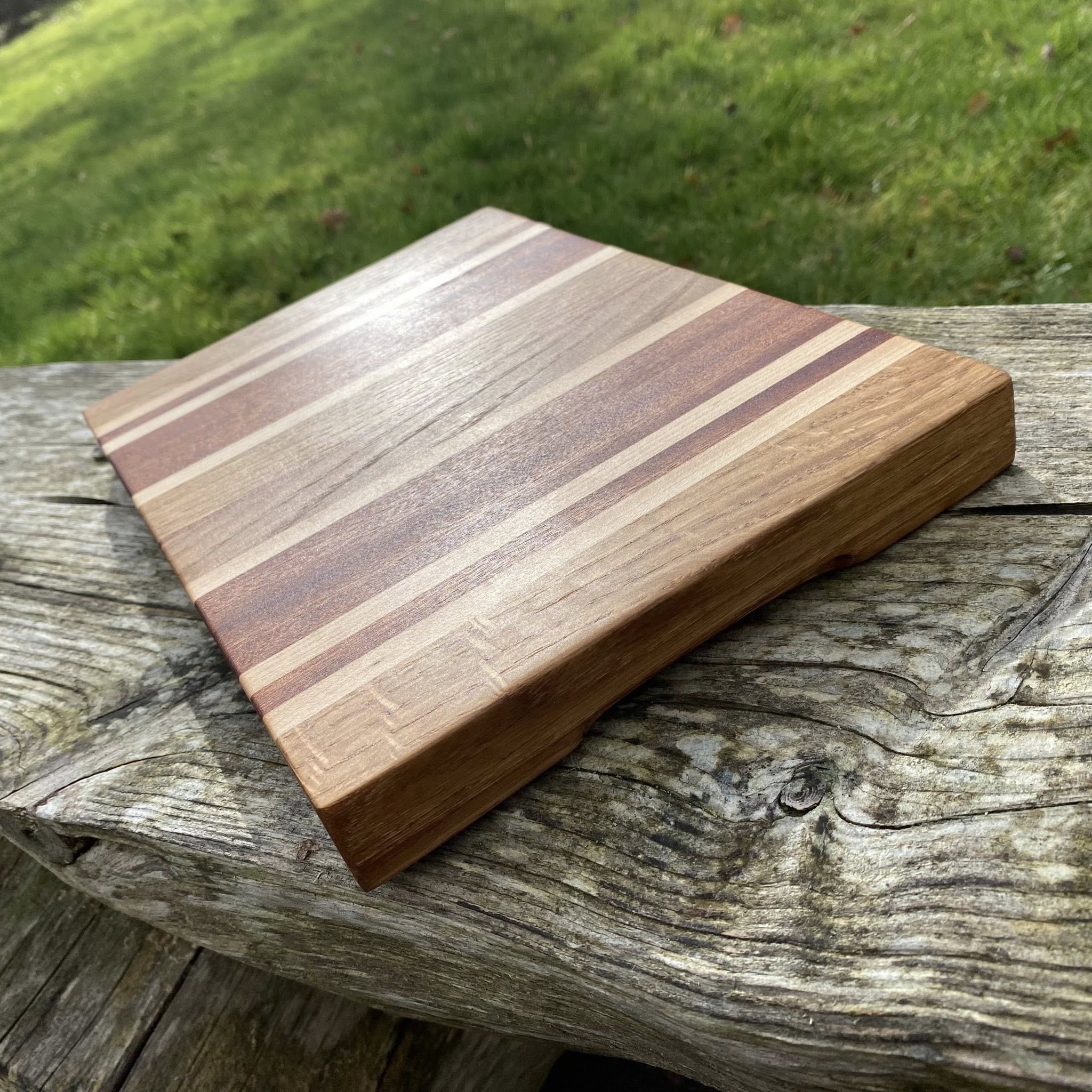 This handcrafted cutting board is made from a beautiful combination of Maple, Sapele and White Oak, carefully selected for both durability and natural character.